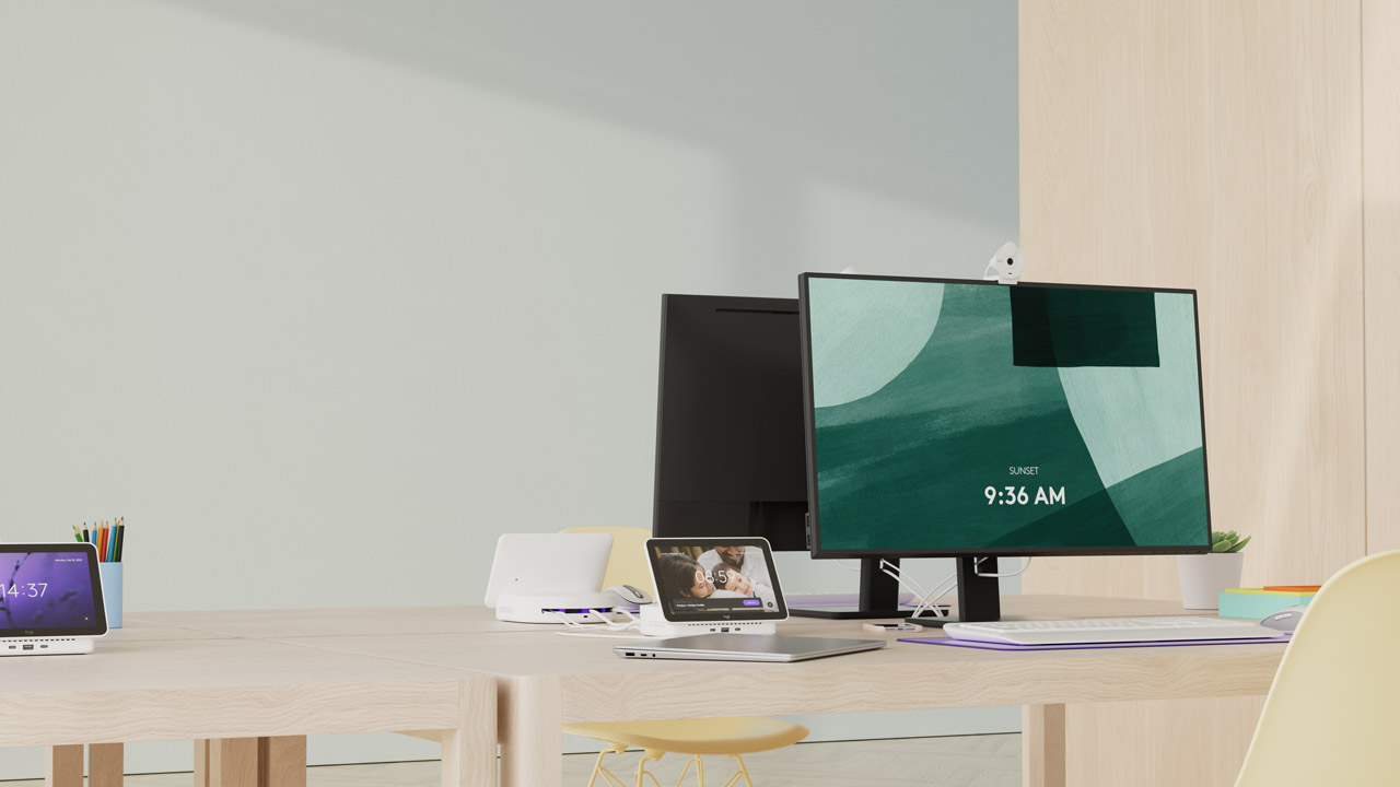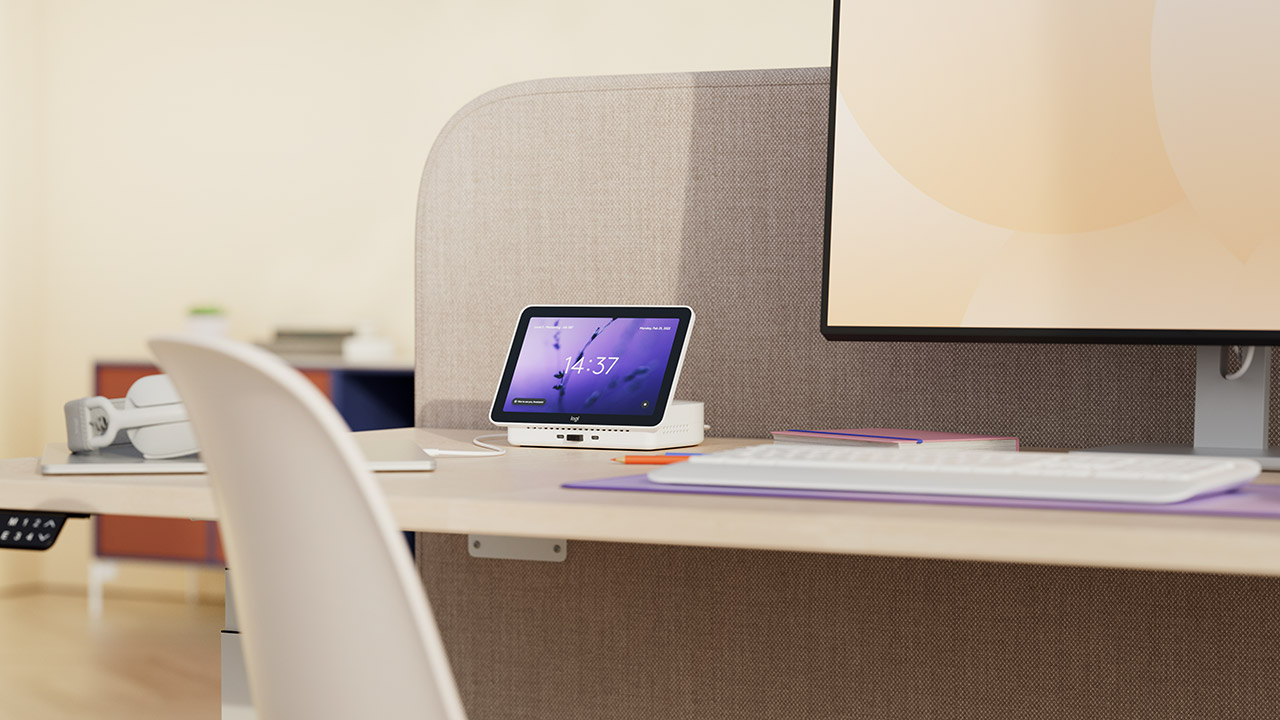 Logi Dock Flex is a managed docking station that enables easy desk booking for employees and a greater ability to manage shared desks across locations. The screen indicates desk availability at a glance, to help employees understand which desks are free to use and which are booked (and by whom).